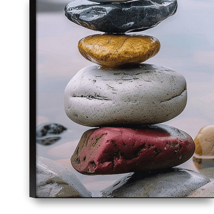 Buy this landscape artwork Zen Balance - Meditative stone towers by the water by Poster Art Shop on canvas, ArtFrame, poster and wallpaper, printed on demand in high quality.
