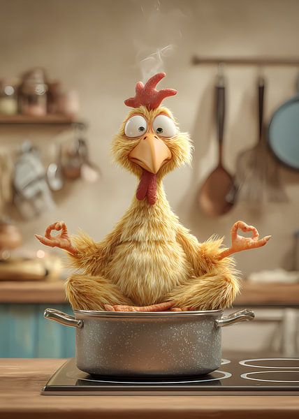 This humorous image shows a chicken sitting in a saucepan, holding a meditative yoga pose. With its eyes closed and its ‘hands’ relaxed, it appears completely at peace with itself – despite the unusual situation. Light steam rises from the pan, whilst the warm, cosy kitchen setting in the background creates a tranquil atmosphere. The…