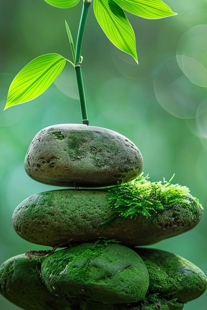 A Zen garden combines the beauty of nature in a perfectly balanced stone tower, crowned by a delicate bamboo shoot. The stones, enveloped in moss and harmoniously arranged, convey a deep sense of calm and serenity. Surrounded by lush greenery and shimmering in the soft light, this work of art invites you to reflect on the balance and simplicity of life. The combination of robust stones and the young bamboo symbolises the combination of strength and growth, the essence of Zen philosophy.