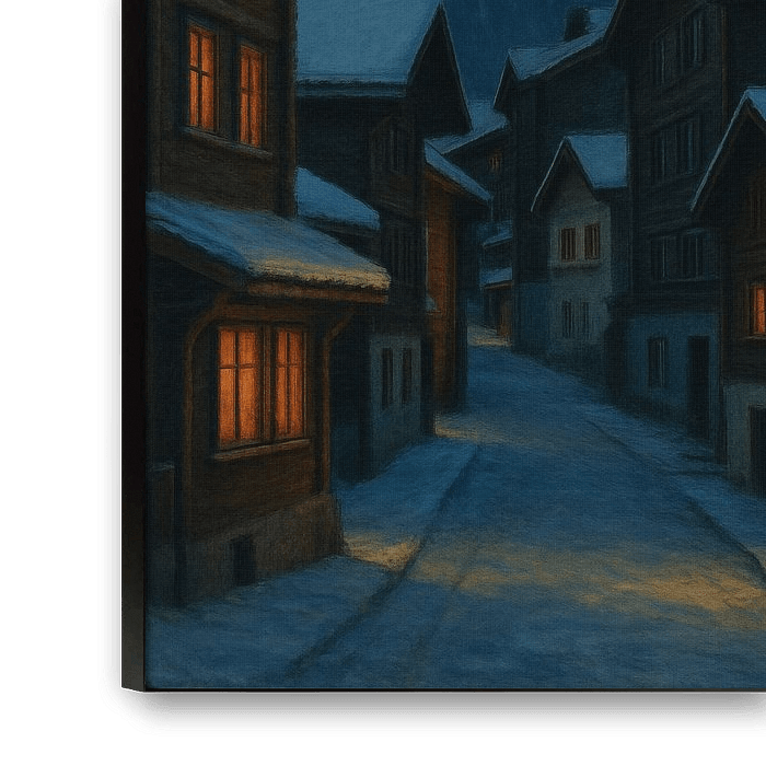 The palette moves from deep indigo to gold, capturing the fragile balance between night and day. The composition’s harmony of geometry and atmosphere creates a feeling of quiet strength, where mountain and village breathe as one.