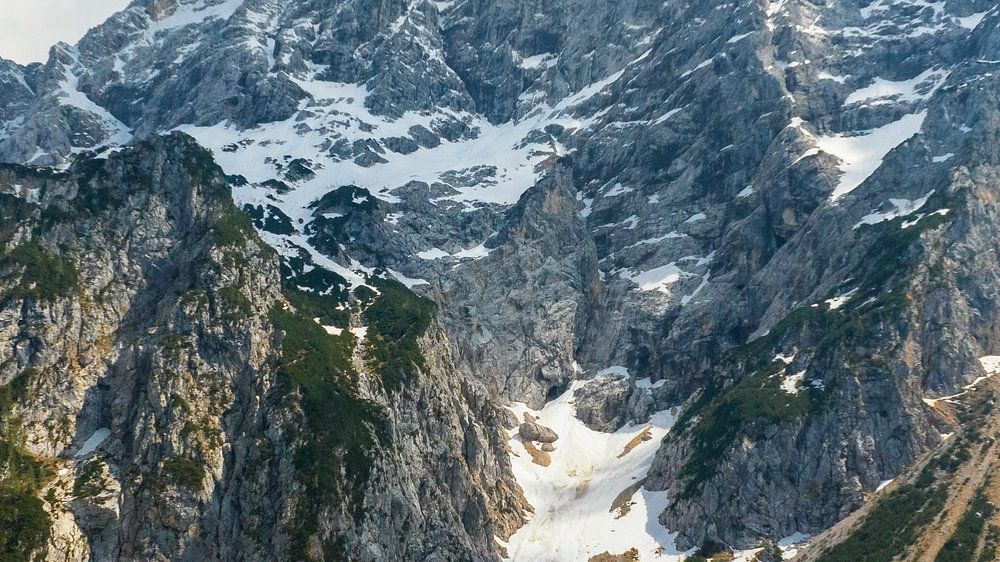 Zgornje Jezersko mountains in Slovenia aerial view during a beautiful springtime day with the mountain range around the Grintovec mountain peak in the Kamnik–Savinja Alps.
