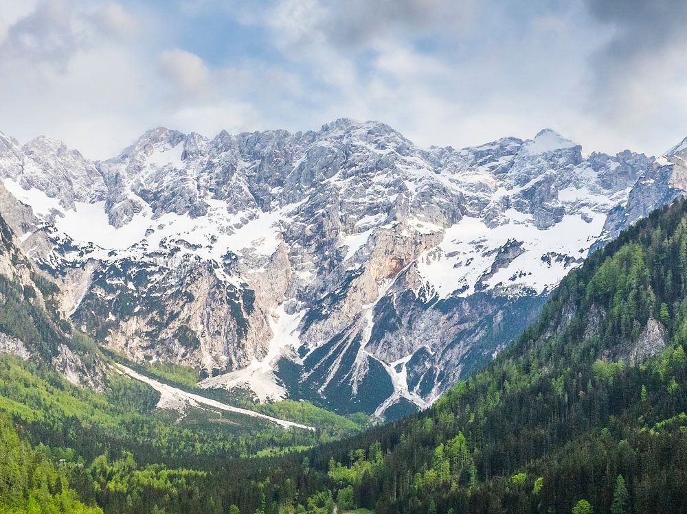 Zgornje Jezersko valley in Slovenia aerial view during a beautiful springtime day with the mountain range around the Grintovec mountain peak in the Kamnik–Savinja Alps.