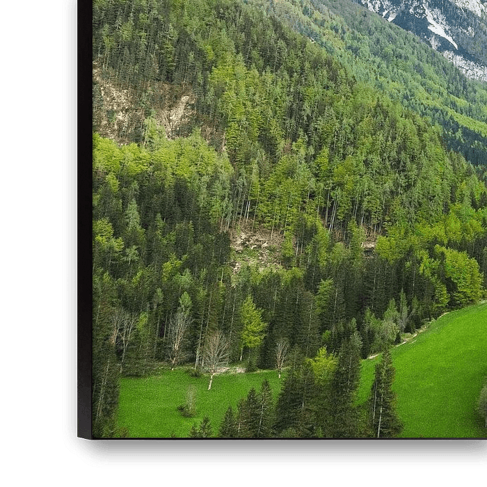 Zgornje Jezersko valley in Slovenia aerial view during a beautiful springtime day with the mountain range around the Grintovec mountain peak in the Kamnik–Savinja Alps.