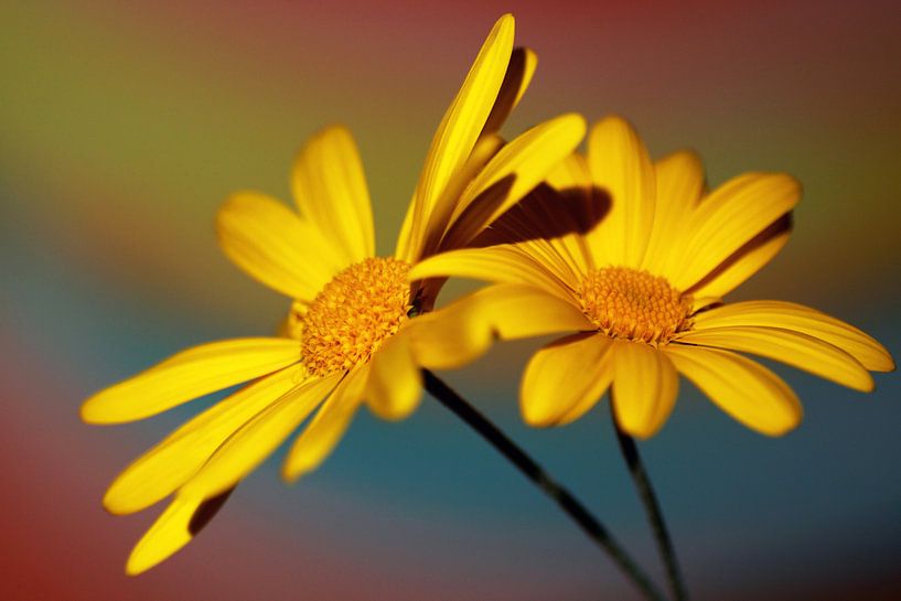 Gele zilverster bloemen met een kleurrijke achtergrond. Samen met zijn tweeën op de foto. Warme kleuren met een tintje blauw, maar waar geel domineert.