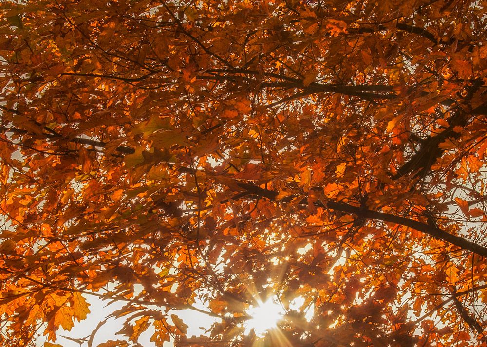 Zonlicht valt door de bomen op prachtige herfstkleuren