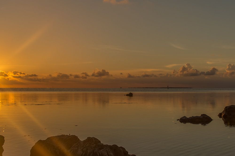 Bij de zonsondergang gaf de zon deze prachtige stralen af. Deze zonnestralen samen met de rotsen geven diepte aan de foto. De kleuren maken de zonsondergang compleet.