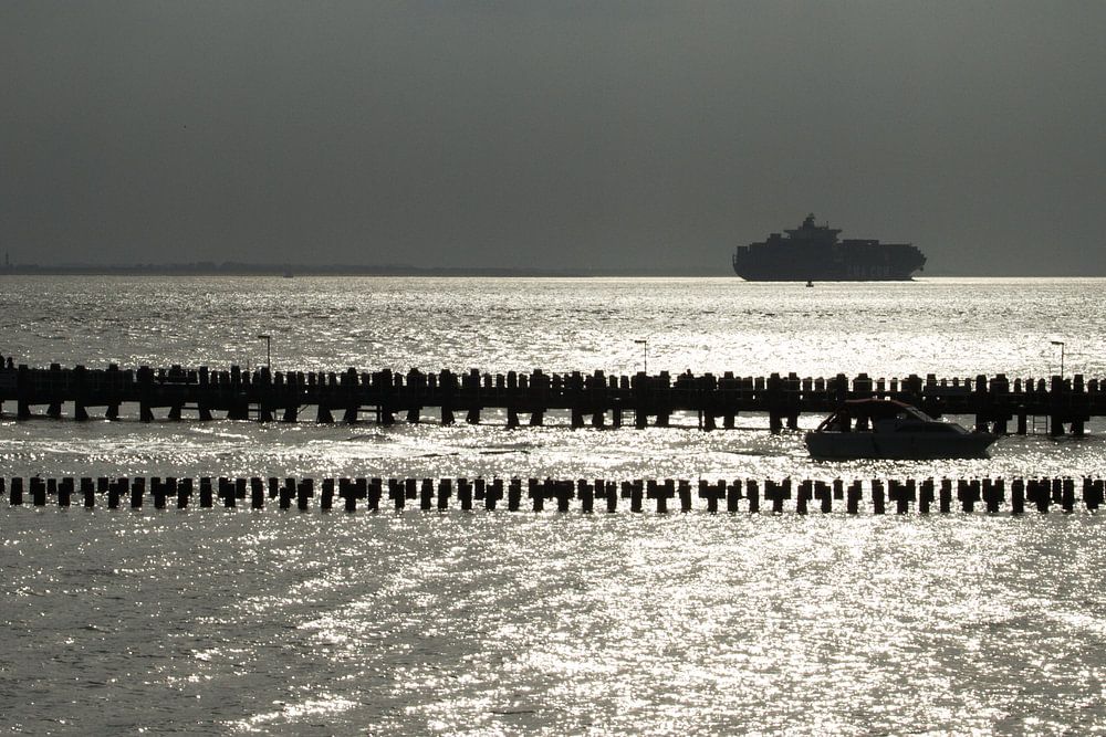Silhouetfoto van een zeeschip op de achtergrond en de zon die het water belicht als een zilveren laken. Op de voorgrond een stuk van het havenhoofd van Vlissingen