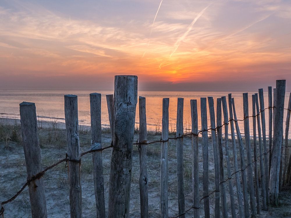 Een mooi kleurenspel tijdens zonsondergang. Foto genomen aan de maasvlakte. een leuk hekje op de voorgrond. de zon zakt hier in de noordzee.
