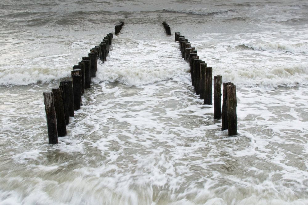 Impression of beach and sea at Zoutelande on Walcheren in Zeeland. Raging sea, white foam heads, a dark sky with sunset. The wooden breakwaters stick out just above the water. The tide is high and the wind pounds against the shore, driving up the water. It is great to look out to sea with the wind in your face and enjoy the waves. It is December, on the cusp of New Year's Eve. Storm Gerrit has just passed, Henk is the next storm on the agenda. The sea is still choppy and the water is higher than normal. It will be some time before things calm down again. But nothing is more beautiful than the ferocious power of water and it is wonderful to witness it. After all, the sea is always pulling in and even now it is great to watch it raging on the beach and how colours and patterns keep changing.