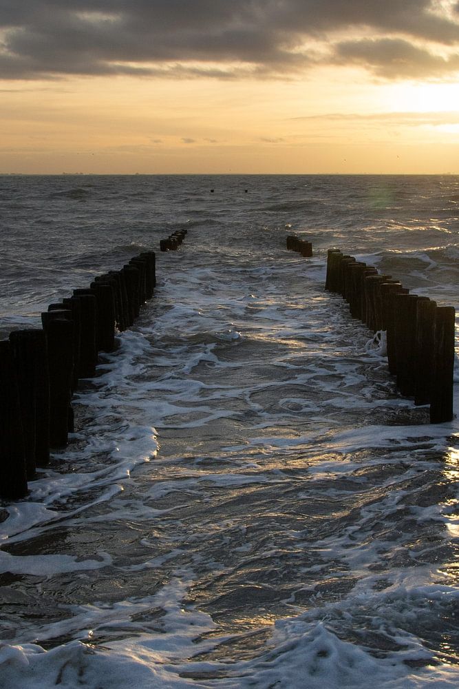 Impression of beach and sea at Zoutelande on Walcheren in Zeeland. Raging sea, white foam heads, a dark sky with sunset. The wooden breakwaters stick out just above the water. The tide is high and the wind pounds against the shore, driving up the water. It is great to look out to sea with the wind in your face and enjoy the waves. It is December, on the cusp of New Year's Eve. Storm Gerrit has just passed, Henk is the next storm on the agenda. The sea is still choppy and the water is higher than normal. It will be some time before things calm down again. But nothing is more beautiful than the ferocious power of water and it is wonderful to witness it. After all, the sea is always pulling in and even now it is great to watch it raging on the beach and how colours and patterns keep changing.