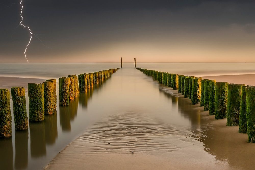 Heavy weather passes along the coast of Zoutelande during the sunset.