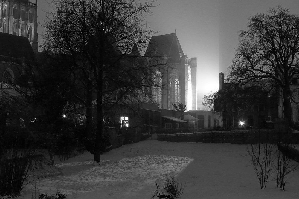 Snowfall at night near the big church in Zutphen. The snow creates a reflection of the floodlights illuminating the church. The snow on the ground makes the dark ground stand out beautifully.