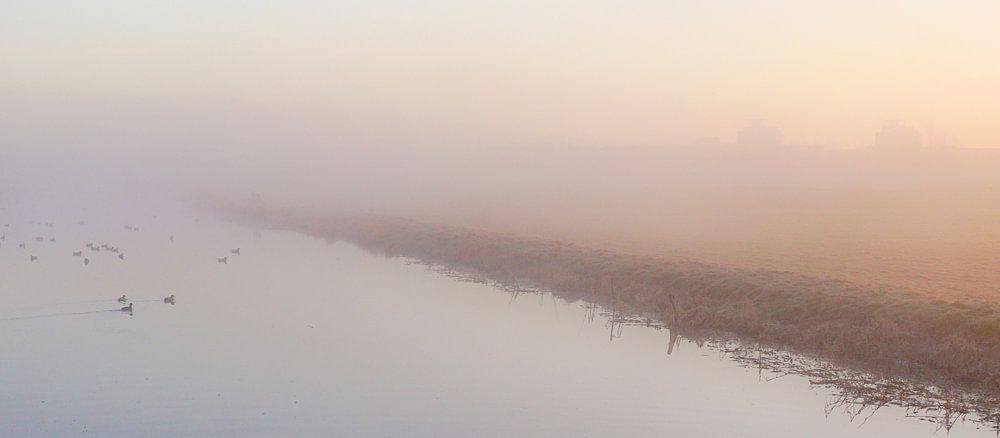 Landschap met zwanen, mist en prachtige kleuren en licht.