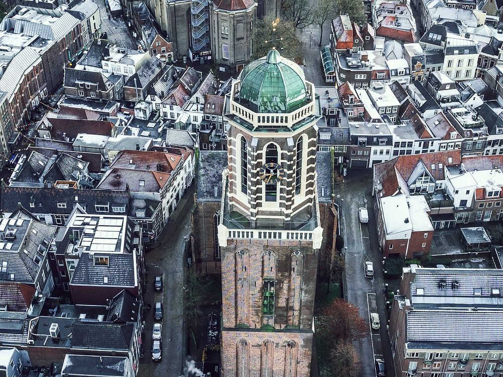 The Peperbus tower of the The Roman Catholic Onze Lieve Vrouwe ten Hemelopneming-basilica church in Zwolle rising up over the snow covered rooftops in the downtown district. The church tower, called Peperbus (pepperpot), is one of the tallest and most famous church towers in the Netherlands.