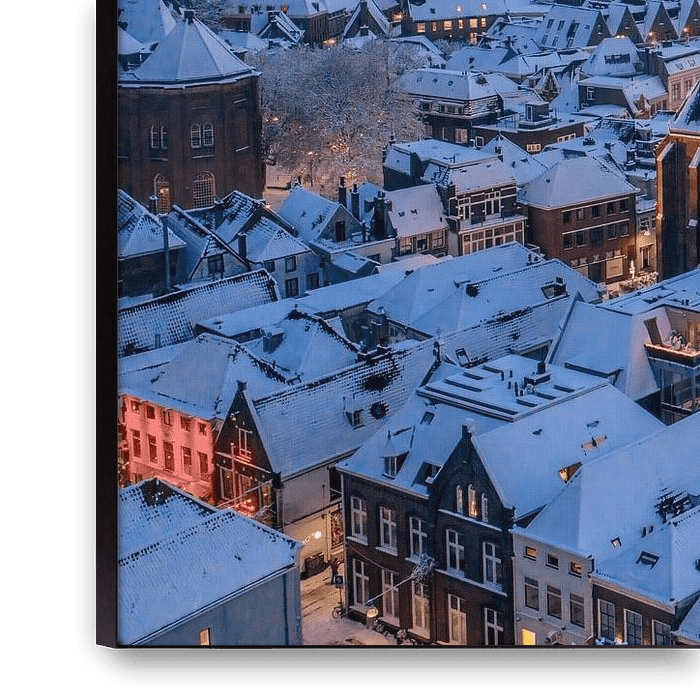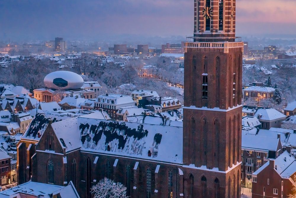 This aerial winter photograph captures the Peperbus, the iconic tower of the Basilica of Our Lady of the Assumption, rising above the historic heart of Zwolle. Fresh snow blankets rooftops, streets, and church spires, softening the city’s geometry and creating a calm, storybook atmosphere. The Peperbus stands tall at the center, its…