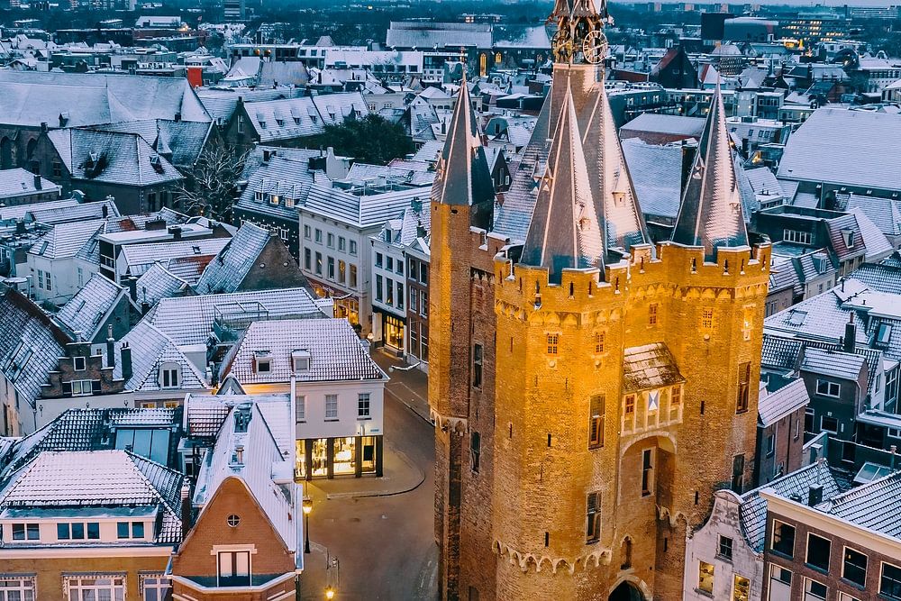 Zwolle Sassenpoort old gate during a cold winter morning with snow on the rooftops in the downtown district seen from above. The Sassenpoort was constructed in the 14th century, specifically between 1406 and 1409, and served as one of the main entrances to the fortified city of Zwolle. It was built as part of the city's defensive walls and was primarily used to control access into the city, as well as to protect its inhabitants from potential threats.The gate's name, "Sassenpoort," translates to "Saxon Gate" in English, which refers to the merchants from the Saxon region who would pass through this entrance into the city. The Sassenpoort was strategically positioned at a crucial location along the city's defensive walls, connecting the city center with the region to the east.Architecturally, the Sassenpoort is an impressive example of Gothic brickwork. It features a rectangular shape with a height of approximately 38 meters (124 feet) and a width of around 20 meters (66 feet). The gate is adorned with decorative elements, including spires, battlements, and turrets, which give it a distinctive and imposing appearance.