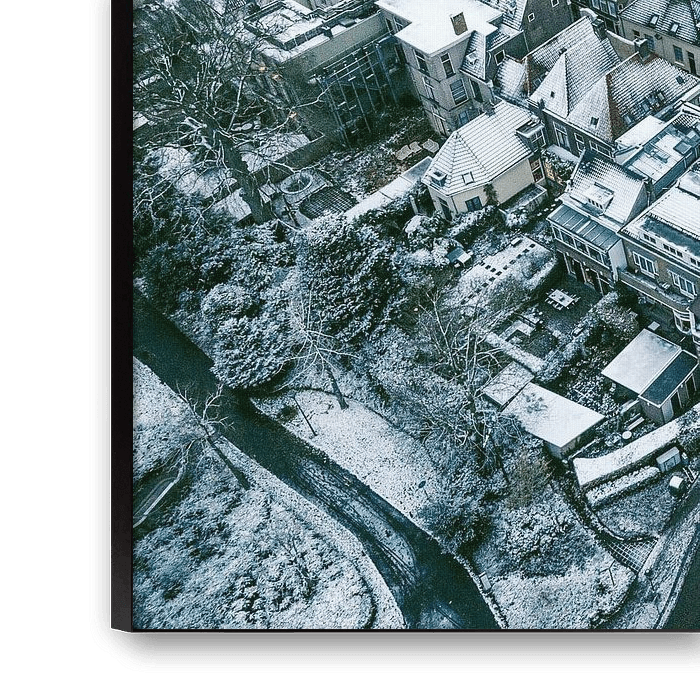 Zwolle Sassenpoort old gate during a cold winter morning with snow on the rooftops in the downtown district seen from above.