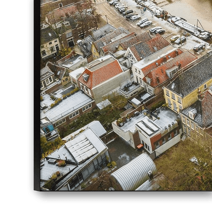 View on the Thorbeckegracht in Zwolle, Overijssel The Netherlands, during a beautiful cold winter morning with some snow on the rooftopas and classic sailing freight ships in the canal. High angle drone view.