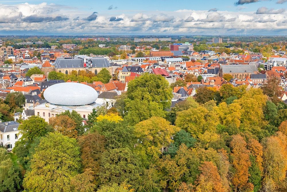 Zwolle downtown district aerial view during a late summer sunset. Seen from above we can see various historical buildings, such as the Peperbus church tower, Sassenpoort and Fundatie museum with the modern design feature on the roof.