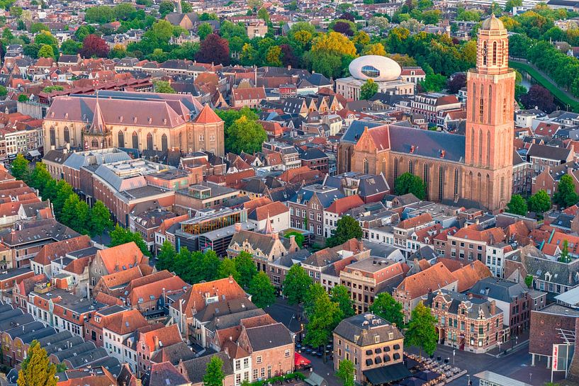Zwolle downtown district aerial view during a springtime sunset. Seen from above we can see various historical buildings, such as the Peperbus church tower and Fundatie museum with the modern design feature on the roof.