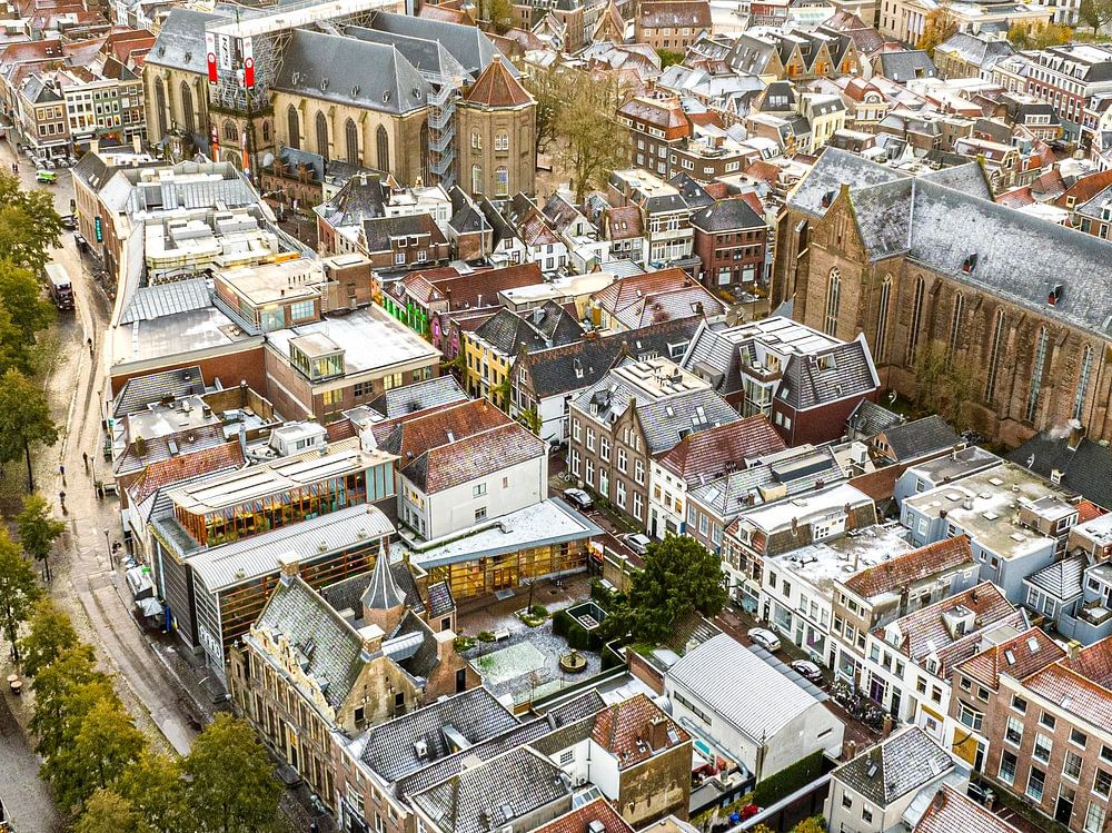 Zwolle downtown district during a cold winter morning seen from above with the Peperbus church tower one of the tallest and most famous church towers in the Netherlands. The rooftops a covered in a thin layer of snow.