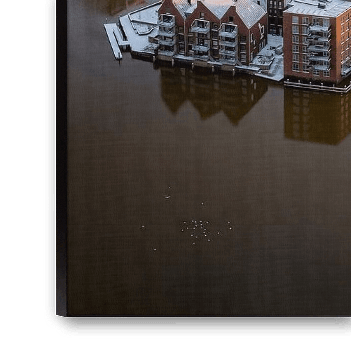 Zwolle downtown district during a cold winter morning seen from above with the Peperbus church tower one of the tallest and most famous church towers in the Netherlands. The rooftops and streets are covered in a thin layer of snow.