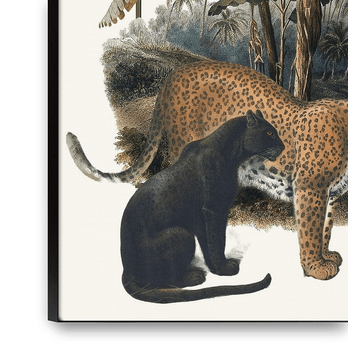 At the heart of the piece stand a majestic spotted leopard and an elegant black panther, side by side in a lush setting of palm…