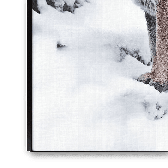 Buy this landscape artwork a big cat Cougar in profile, against a background of rocks and snow, view of the beast from the side by Michael Semenov on canvas, ArtFrame, poster and wallpaper, printed on demand in high quality.