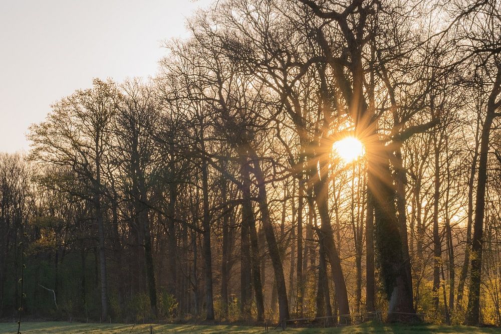 landscape in Ruurlo, the Achterhoek in Gelderland, where the sun rises between the trees and casts a beautiful shadow over the meadow