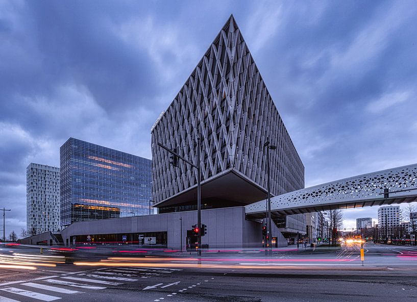 The photograph shows the cycle bridge in Antwerp, situated at the corner of the Leien and Noorderlaan, in a dynamic urban setting. The image was taken using a slow shutter speed, causing the streaks of light from passing traffic to flow across the foreground as smooth lines.