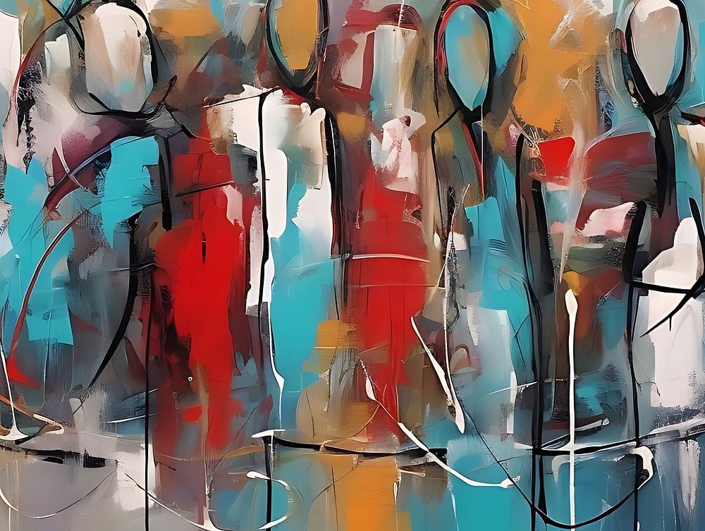 Vibrant silhouettes dance on the abstract canvas like colourful shadows. Human forms are captured in a swirl of bold hues, a celebration of diversity and emotion. Expressive brushstrokes weave together, forming a dynamic play of movement and life. Each figure carries unique colours, a symphony of individual stories. The painting seems like a vibrant society of shapes and shades, a visual rendition of human connections and experiences. The colour palette is bold and exuberant, bringing the canvas to life with the energy of human existence.