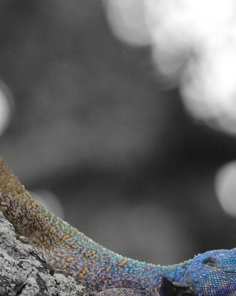 This blue-throated dragon sat in the tree near a picnic site on the Serengeti in Tanzania, Africa.