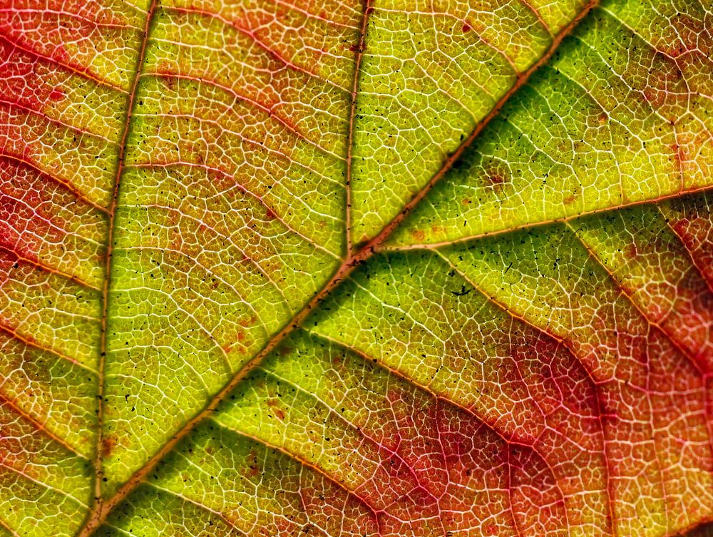 close up of autumn leaves with leaf vein structures visible in sunlight