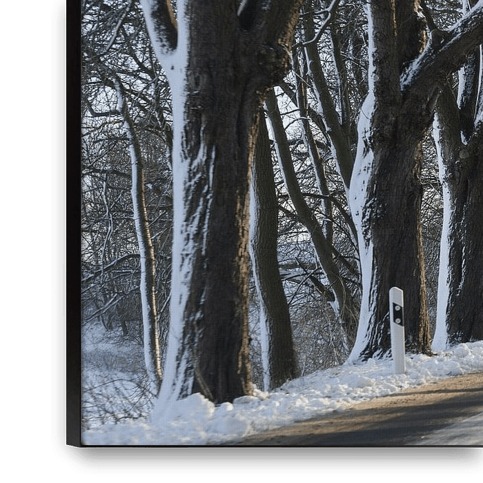 Buy this landscape artwork avenue in winter with dark bare trees and white snow, dangerous driving concept, copy space, selecte by Maren Winter on canvas, ArtFrame, poster and wallpaper, printed on demand in high quality.