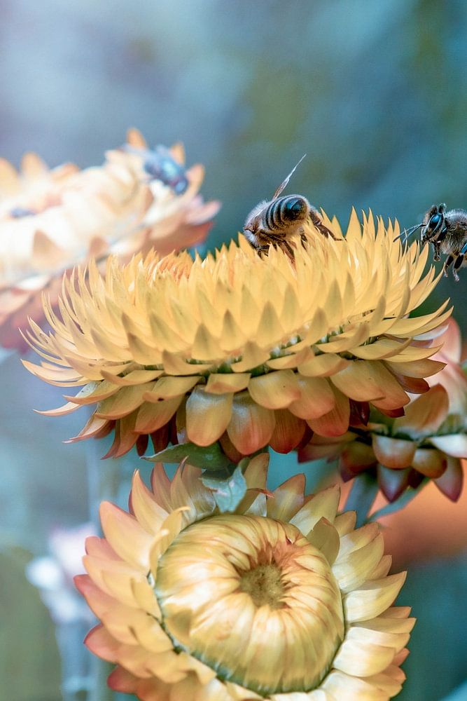 Macro picture of some bees hard at work on a group of flowers. ( xerochrysum bracteatum )
