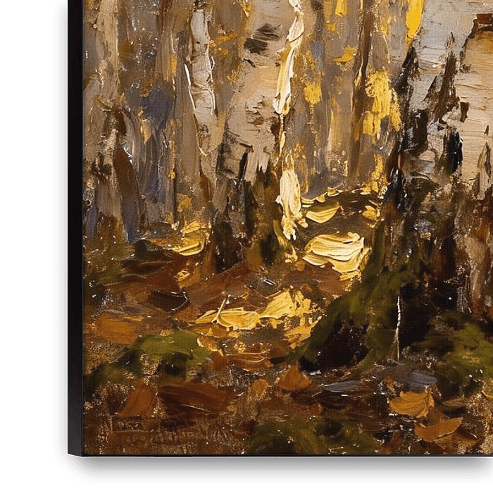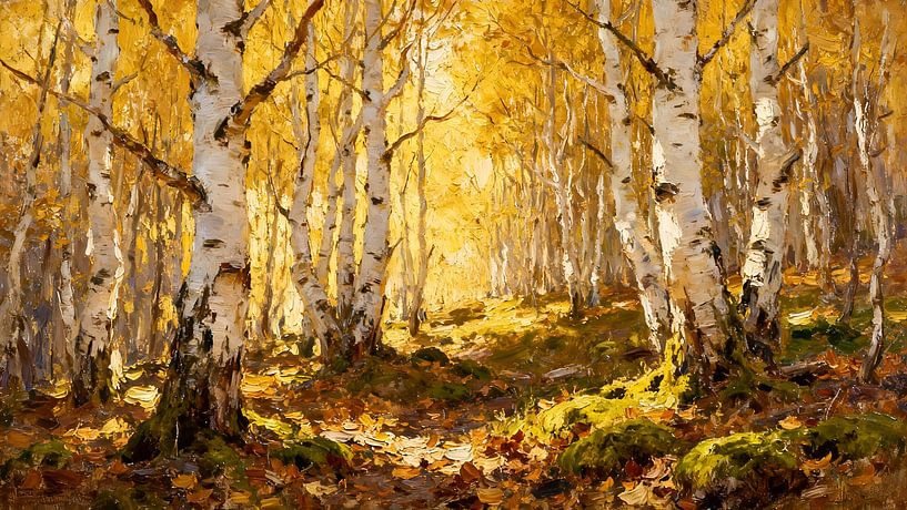 Slender birch trunks in brilliant white stand in rows like the columns of a cathedral, whilst their golden canopy transforms the autumn light into a warm, almost supernatural glow. The forest floor, covered in colourful foliage and green moss, enhances the sense of depth and invites the eye to wander ever further into the radiant heart…