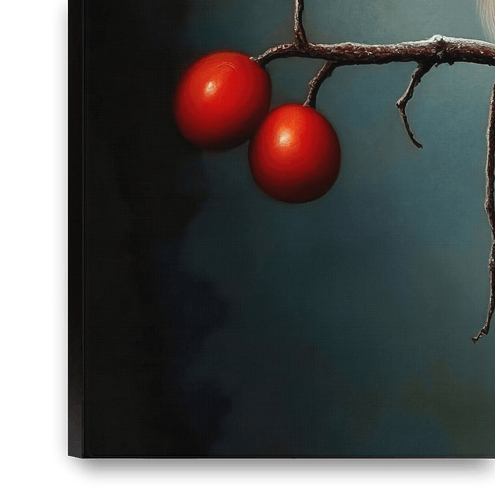 An intimate little scene: a little bird with bright red breast sits gracefully on a thin branch with red berries, caught in a beautiful, warm light reminiscent of the masterful atmosphere of a Rembrandt painting. The little bird, with its striking red-orange breast, is a vivid accent against the subtle background, which is shrouded in…