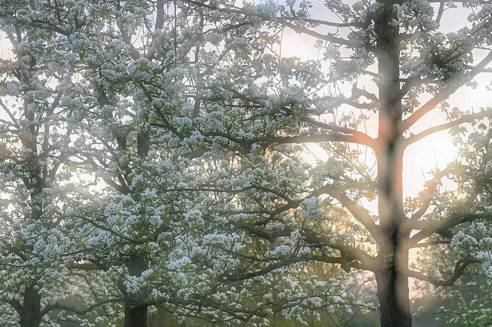 Landscape in Waardenburg, on the Betuwe in Gelderland, with a view on the blossoming fruit trees in the golden light of the morning, photographed with multiple exposures