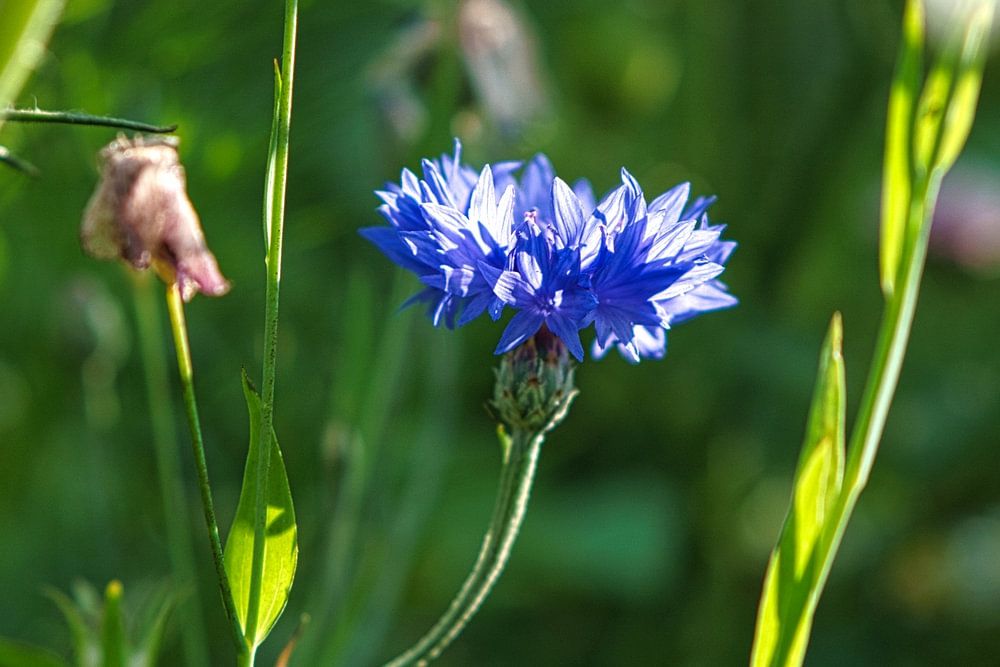 Blue cornflower in a cornfield. A splash of colour in agriculture.