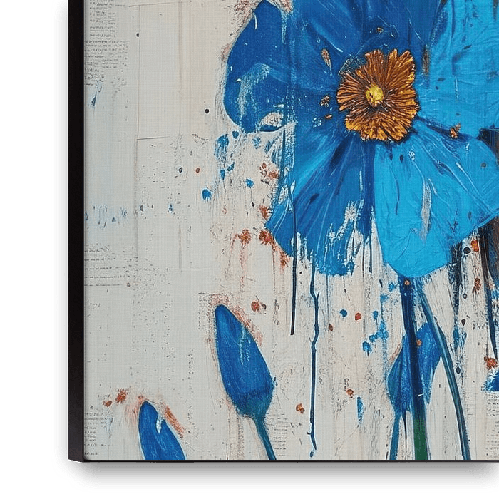 De tweede blikvanger zijn de bloemen — vier of vijf grote bloemen in intens blauw, geplaatst rondom het gezicht als een soort luide corona. Ze zijn niet kieskeurig geschilderd; je ziet dikke lagen verf, spatjes en druppels, en bij de hartjes een warme gele touch die als zonnestralen tegen het blauw staan. Deze bloemen fungeren als een patroon en als emotie: een bloemen schilderij dat tegelijk organisch en abstract werkt. De bloemblaadjes zijn ruw afgewerkt, met zowel fijne lijnen als grove vegen, waardoor ze niet alleen versieren maar ook het ritme van het schilderij bepalen. Ze lijken bijna te groeien uit de achtergrond en het haar, alsof herinneringen en natuur zich mengen met de stadsreflecties in de bril.