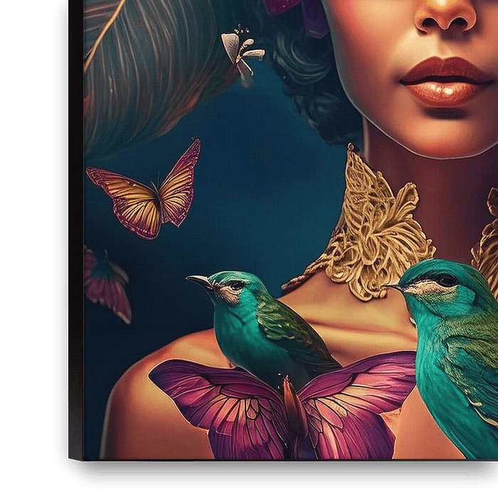 A colourful portrait of a blindfolded woman, Decorated with tropical leaves, peonies and dried flowers. This work has a softer romantic feel, but highlights the beauty and, above all, the strength of each woman. Sometimes we feel the need to turn in on ourselves and dream of beautiful surroundings. Full of beautiful flowers and fragrant…