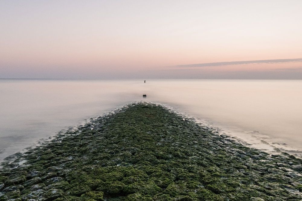 the sun slowly sinks into the sea. the long shutter speed made the water look like milk