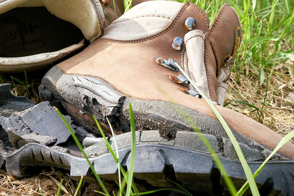 Broken old hiking boots on a popular hiking trail in the Harz National Park