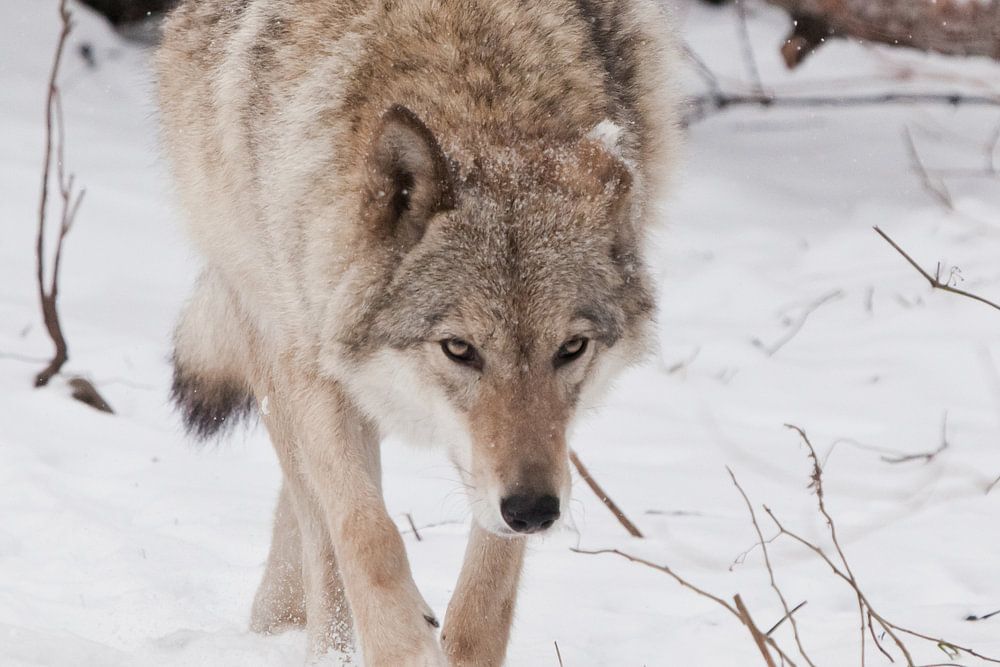 calmly and dangerously goes. beast hunting sniffs prey. Gray wolf female in the snow, beautiful stro by Michael Semenov
