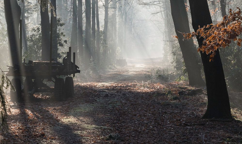 sunlight with sunbeams in the morning and old wooden car in the foothpath in winter forest with ice and trees