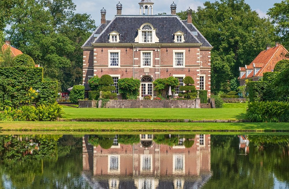 castle warmelo with reflection in the water, the garden of the castle is used for a anual sand sculpture statute competition