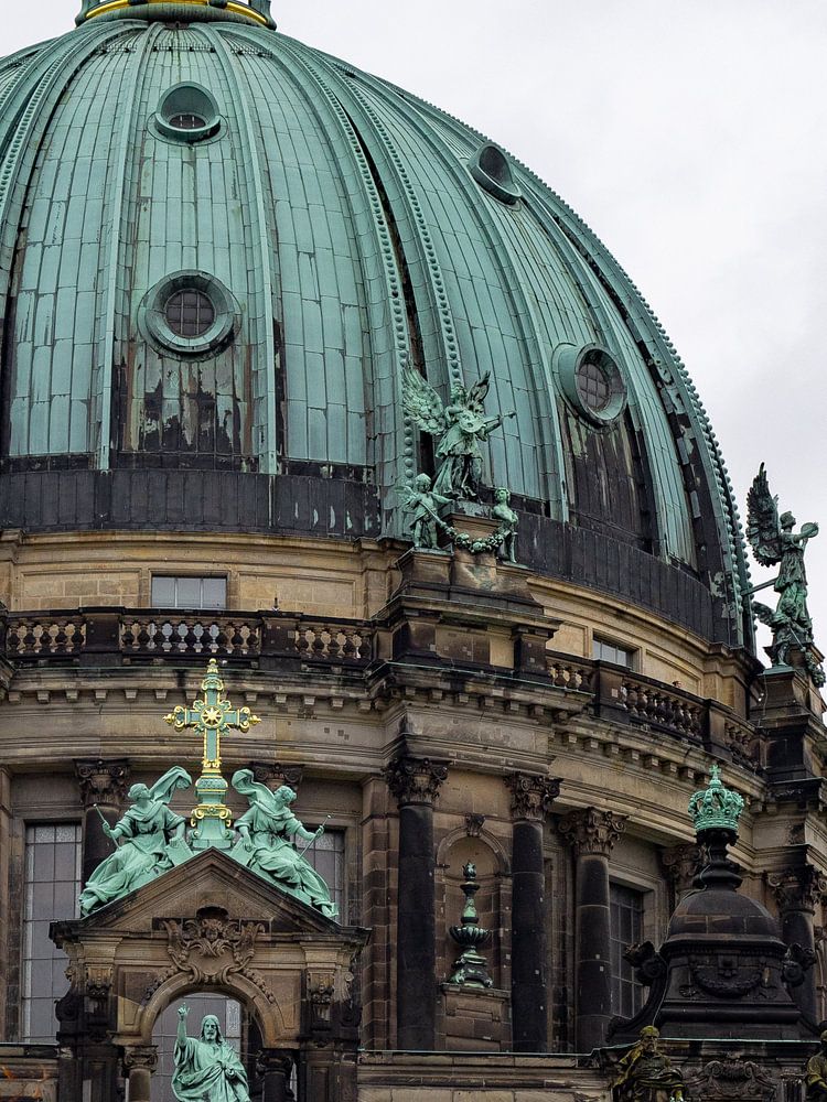 the large dome of the cathedral of berlin is a feast for the eyes both outside and inside, a very beautiful building. in the background the tv tower of berlin is clearly still visible. beautiful together in 1 image 2 iconic buildings of this beautiful city.