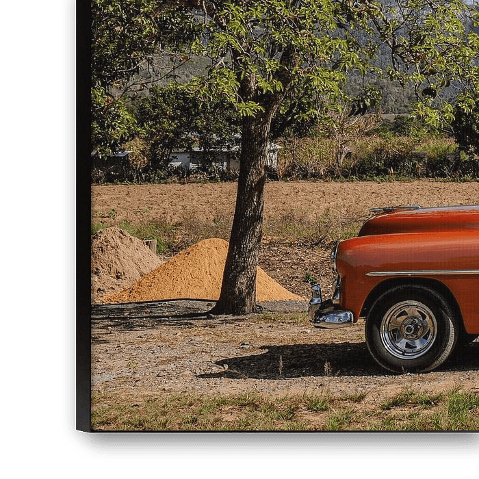 Made on 31 March 2025 at Finca Tabacum, a tobacco plantation in the valley of Viñales, Cuba. A gleaming orange vintage car is parked under the tropical sun, surrounded by palm trees and the rugged silhouette of limestone hills in the distance. The image captures the essence of the Cuban landscape: tradition, colour and tranquillity. Here, past and present melt together - a moment where the charm of rural life and the nostalgia of classic cars'meet.
