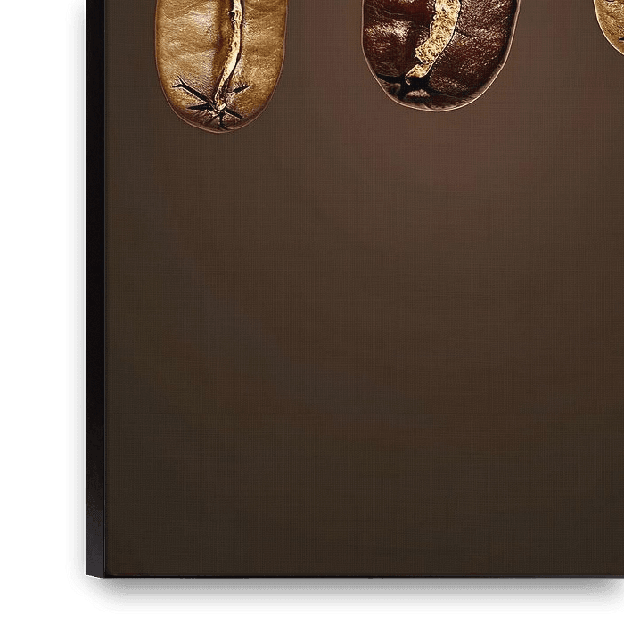 A painting reveals a multitude of coffee beans in a colour palette of earthy tones and deep black shadows. Each bean tells its own story, from the robust aromas's of dark espresso beans to the subtle sweetness of lightly roasted arabica's. The composition reflects the diversity of the coffee world, a rich symphony of flavours…