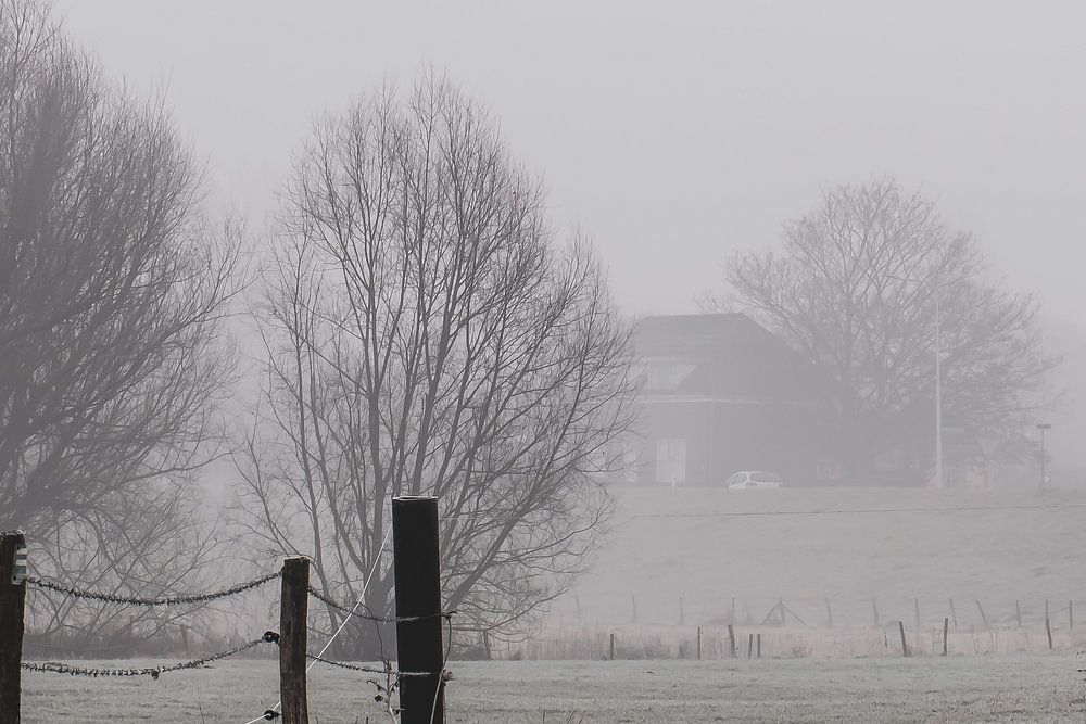 a winter landscape along the Rhine at Driel, where visibility is restricted by thick fog, and the grass white with frost
